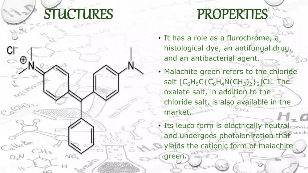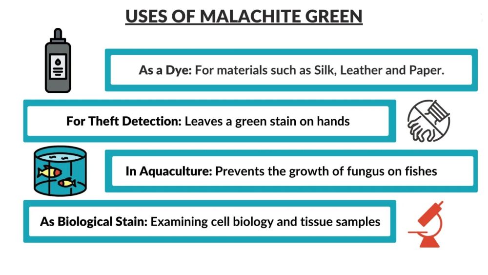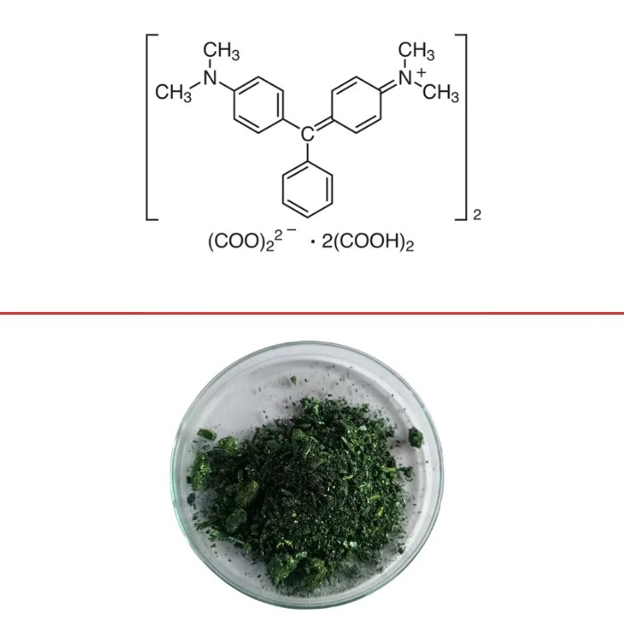 Genel Bakış : Malakit yeşil oksalat, enzimatik reaksiyonlarda fosfat salınımını tespit etmek için kullanılabilen bir trifenilmetan boyasıdır. Basic Green 4, Malakit Yeşili olarak da adlandırılan organik bir bileşiktir. Yaygın olarak boyalarda ve antibakteriyel olarak kullanılır. Özellikle Basic Green 4, Piridinler, Fosfinler ve Aminler gibi reaktif gruplar altında kategorize edilebilir; Aromatik hidrokarbonlar; Alifatik Doymamış Hidrokarbonlar; Konjuge Dienler; Fosfonyum Tuzları ve Kuaterner Amonyum. Bileşiğin adı malakit mineralinin rengine benzerliğinden kaynaklanmaktadır. Buna ek olarak, Basic Green 4, suda çözündüğünde mavi-yeşil bir çözeltinin yanı sıra belirgin bir metalik parlaklığa sahip koyu yeşil kristaller olarak da görülebilir. Basic Green 4, C23H25CIN2 moleküler formülüne sahiptir ve etanol, amil alkol, metanol ve suda (Cameo Chemicals) yüksek çözünürlüğe sahiptir. Kullanım Alanları : Basic Green 4, Yerel, Anti-Enfektif Ajanlarda kullanılır; Endüstriyel, Mantar öldürücüler. Dahili bir antiseptik olarak köpeklerde dizanteri ve buzağı ishallerini tedavi etmek için uygulanırken, harici bir antiseptik olarak yılan otu, parlak yeşil ve rivanolden oluşan üçlü bir boya olarak sıyrıklara ve enfekte yaralara uygulanabilir. Malakit yeşili oksalat (arilmetan boyası) su ürünleri yetiştiriciliğinde mikotik enfeksiyonlara karşı çare olarak da kullanılır. Geleneksel olarak malakit yeşili boya olarak kullanılır. Biyolojik leke, boya reaktifi, asit baz göstergesi: pH 0,0 sarı, 2,0 yeşil; 11,6 yeşil, 14 renksizMalakit Yeşili oksalat, gömülü botanik materyal için boyama çözeltisi ve spor lekesi olarak kullanılır. Ayrıca TiO2/WO3 ile fotokatalitik bozunmanın incelenmesinde de kullanılır. Serumdaki fosfatın belirlenmesi için ve analitik kimyada miktar tayini için referans materyal olarak kullanılır. Ayrıca pH 0,2 – 1,8 arasında pH göstergesi olarak da kullanılır. İpek, deri ve kağıt gibi malzemelerde boya olarak kullanılır. Hücre canlılığı testi için Alexander boyama solüsyonunun hazırlanmasında. Bağlayıcı immünoglobulin proteininin (BiP) adenozin trifosfataz (ATPase) aktivitesini belirlemek için malakit yeşili-amonyum molibdat tahlilinde Hidrofobik bir iyon olarak, Escherichia coli’nin canlı hücre zarlarındaki etiketsiz moleküler taşınımı ikinci harmonik nesil (SHG) yöntemiyle gerçek zamanlı olarak incelemek için Toksisite : Basic Green 4’ün yutulması, solunması veya ciltle teması, kritik yaralanmalara ve bazı durumlarda ölüme neden olabilir. Özellikle maddenin erimiş hali ile temasta bulunulduğunda gözlerde ve ciltte akut yanıklar meydana gelebilir. Etkilerin solunması ve hatta temas halinde gecikebileceğini belirtmekte fayda var. Ayrıca elementin ateşe maruz kalması toksik, aşındırıcı ve tahriş edici gazların oluşmasına neden olabilir. Ayrıca, suyla seyreltme veya yangın kontrolüyle elde edilen akış, kirliliğe yol açacak şekilde oldukça toksik veya aşındırıcı olabilir. Risk yönetimi : Tahliye ve İzolasyon, dökülme veya yangına karşı en acil önlemdir. Özellikle katı dökülmeler için izolasyon 25 metreyle, sıvı sızıntıları veya dökülmeler için ise 50 metreyle sınırlandırılmalıdır. Tankın bir yangın kazasına karışması durumunda izolasyon 800 metre ile sınırlandırılmalıdır. Küçük yangınlarla mücadele etmek için CO2, kuru kimyasal, alkole dayanıklı köpük veya su spreyi kullanın. Büyük yangınlarda dikkatli olunmalı ve tanklara su girmemesini sağlayacak şekilde monitör nozulları veya insansız hortumlarla yangına uzaktan müdahale edilmelidir. Yangınla mücadele sırasında mutlaka solunum cihazı ve koruyucu kıyafet giyilmelidir. Temas halinde ilk yardım için, tıbbi personele başvurmadan önce kişinin gözlerine veya cildine yaklaşık 20 dakika boyunca su ile yıkanması gerekir.